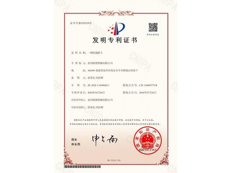 Invention Patent Certificate (for a Leak proof Grab)